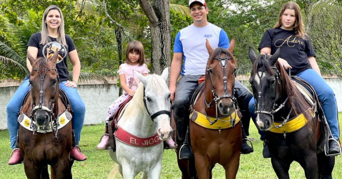 Pastor Júnior Tércio com sua família montada em cavalos. Foto: Divulgação