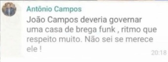 Na mensagem, Antônio afirmou que João “deveria governar uma casa de brega funk”. "Respeito muito o ritmo, não sei se merece ele", completou.