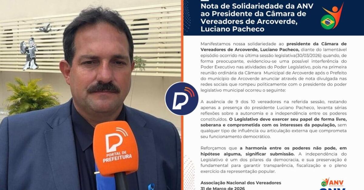 "Manifestamos nossa solidariedade ao presidente da Câmara de Vereadores de Arcoverde, Luciano Pacheco, diante do lamentável episódio ocorrido na última sessão legislativa(30/03/2026) quando, de forma preocupante, evidenciou-se uma possível interferência do Poder Executivo nas atividades do Poder Legislativo, pois na primeira reunião ordinária da Câmara Municipal de Arcoverde após o Prefeito do município de Arcoverde anunciar através de nota divulgada nas redes sociais que rompeu politicamente com o presidente do poder legislativo municipal ocorreu o seguinte: