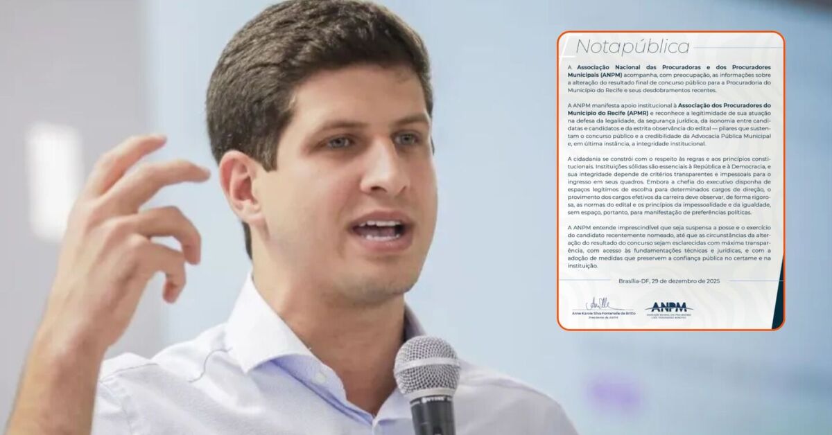 Na segunda-feira, 29 de dezembro, a Associação Nacional das Procuradoras e dos Procuradores Municipais (ANPM) divulgou uma nota pública em que questiona uma possível nomeação irregular feita pelo prefeito João Campos (PSB) no concurso público para procurador do Município do Recife.