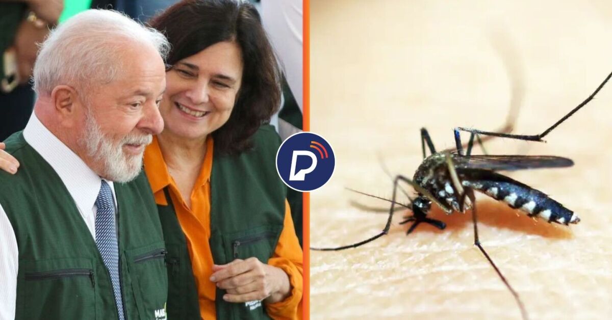 A imagem ilustra a ministra Nísia Trindade abraçada com Lula, ao lado de um mosquito da dengue. Foto: Agência Brasil