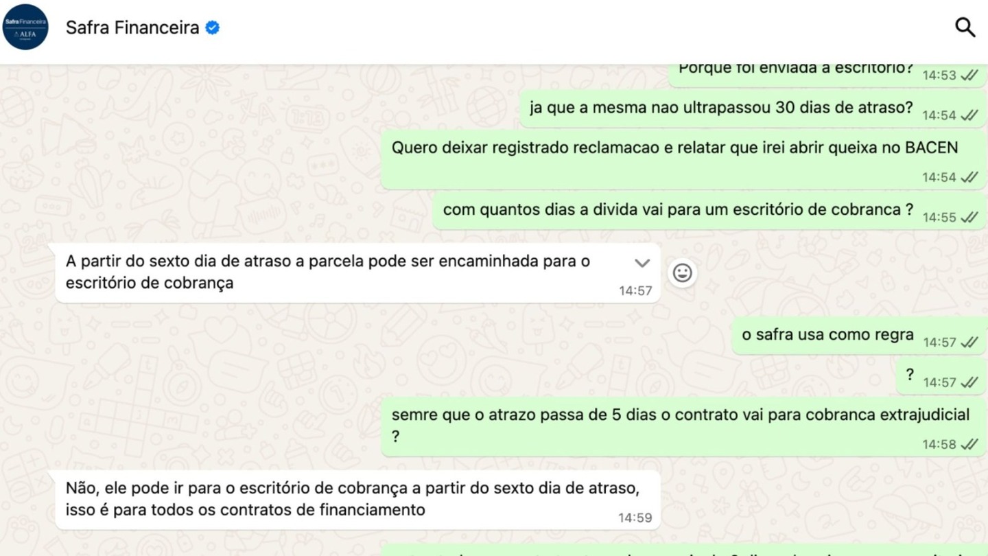 Em uma das reclamações registradas no Reclame Aqui, a Safra Financeira respondeu oficialmente ao consumidor que afirmava que seu contrato havia sido entregue a um escritório de cobrança após apenas 6 dias de atraso.