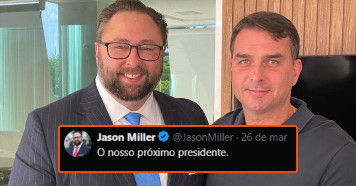 O empresário Jason Miller, conselheiro do presidente dos Estados Unidos, Donald Trump, publicou uma foto nesta quarta-feira, 26, com o senador Flávio Bolsonaro (PL-SP), em apoio à sua pré-candidatura ao Planalto.
