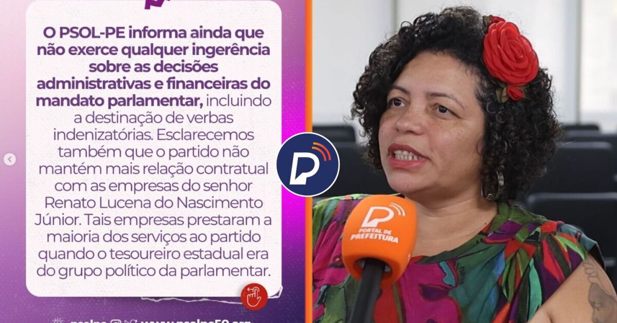 O PSOL-PE informa ainda que não exerce qualquer ingerência sobre as decisões administrativas e financeiras do mandato parlamentar, incluindo a destinação de verbas indenizatórias. Esclarecemos também que o partido não mantém mais relação contratual com as empresas do senhor Renato Lucena do Nascimento Júnior. Tais empresas prestaram a maioria dos serviços ao partido quando o tesoureiro estadual era do grupo político da parlamentar.