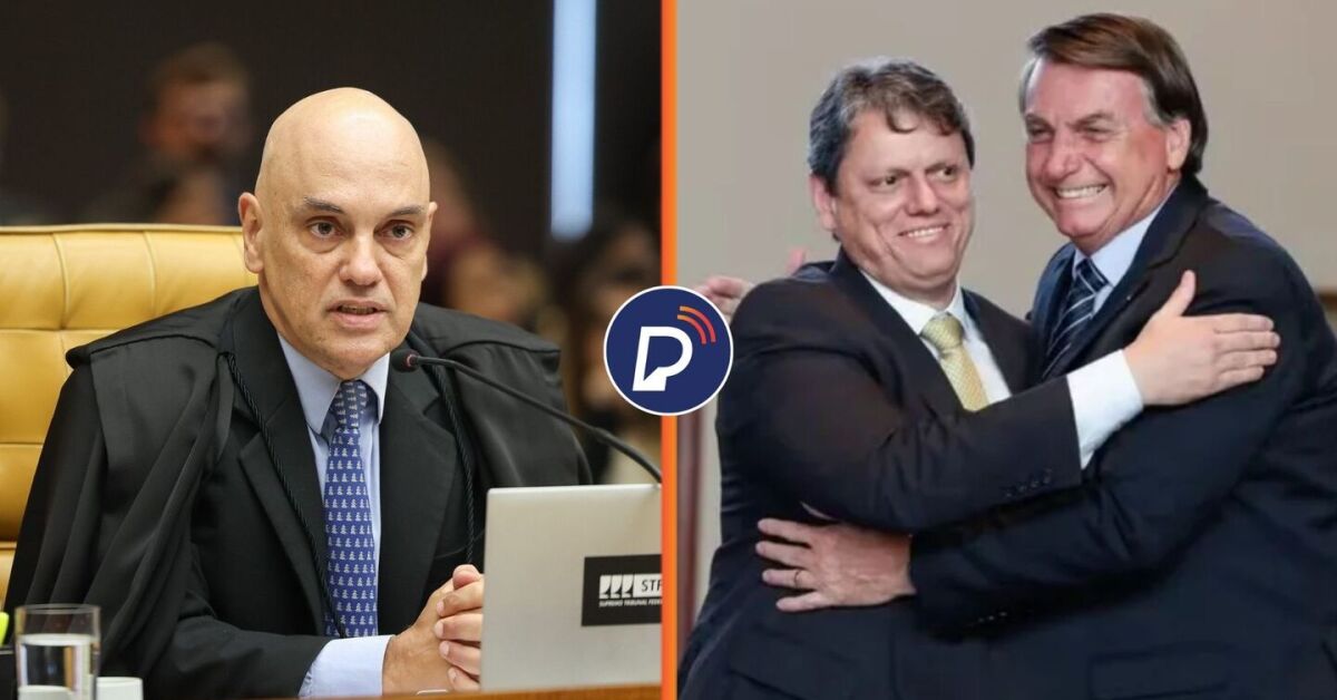 Ministro Alexandre de Moraes, do STF e Bolsonaro abraçado com Tarcísio de Freitas. Fotos: Fellipe Sampaio/STF e Alan Santos/PR. Arte: Portal de Prefeitura