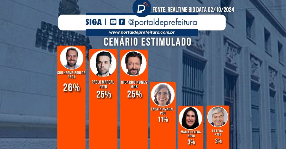 O deputado federal Guilherme Boulos (PSOL) tem 26% das intenções de voto, o prefeito de São Paulo, Ricardo Nunes (MDB), e empresário e influenciador Pablo Marçal (PRTB), 25% cada. A margem de erro do levantamento é de três pontos porcentuais.
