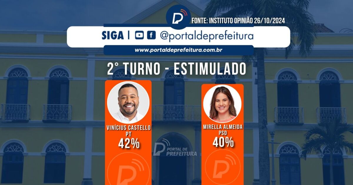 Segundo pesquisa do Instituto Opinião, divulgada nos primeiros minutos da madrugada deste sábado, 26 de outubro, Mirella Almeida (PSD) e Vinicius Castello (PT) estão empatados tecnicamente.