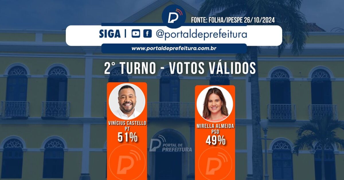 Na pesquisa estimulada - em que são apresentadas as opções de candidatos ao entrevistado –, Castello aparece com 51% dos votos válidos, enquanto Mirella tem 49%. Os votos válidos são aqueles direcionados aos candidatos, sem contabilizar os brancos e nulos.