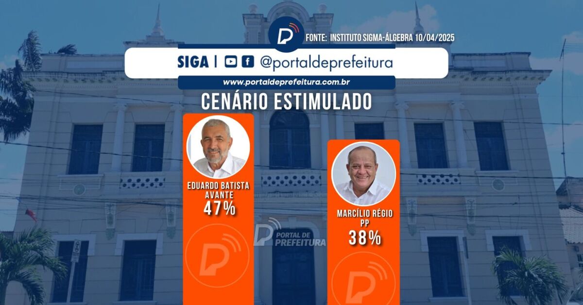 No cenário estimulado, onde os nomes dos candidatos são apresentados ao eleitor, Eduardo Batista (Avante) aparece na liderança com 47% de intenções de votos, contra 38% do adversário, Marcílio Régio (Progressistas). Os dados ainda apontam que 10% não souberam responder, enquanto 3% não responderam e 2% somam Branco ou nulo.