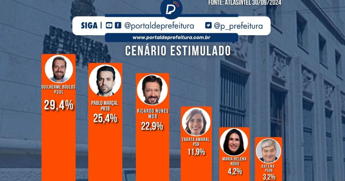 O deputado federal Guilherme Boulos (PSOL) tem 29,4% das intenções de voto, numericamente à frente, mas tecnicamente empatado com o ex-coach Pablo Marçal (PRTB), com 25,4%. O atual prefeito Ricardo Nunes (MDB) aparece com 22,9%, empatado dentro da margem de erro, de 2 pontos porcentuais (p.p.), com o influenciador. Os dados são do cenário estimulado da pesquisa AtlasIntel divulgada nesta segunda-feira, 30.