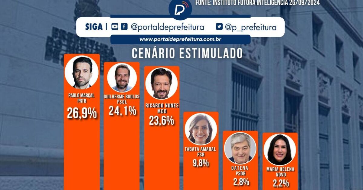 Pesquisa do instituto Futura Inteligência, em parceria com a empresa 100% Cidades, divulgada na última quinta-feira, 26 de setembro, mostra o influenciador Pablo Marçal (PRTB) liderando a disputa pela Prefeitura de São Paulo com 24,1% das intenções de voto.