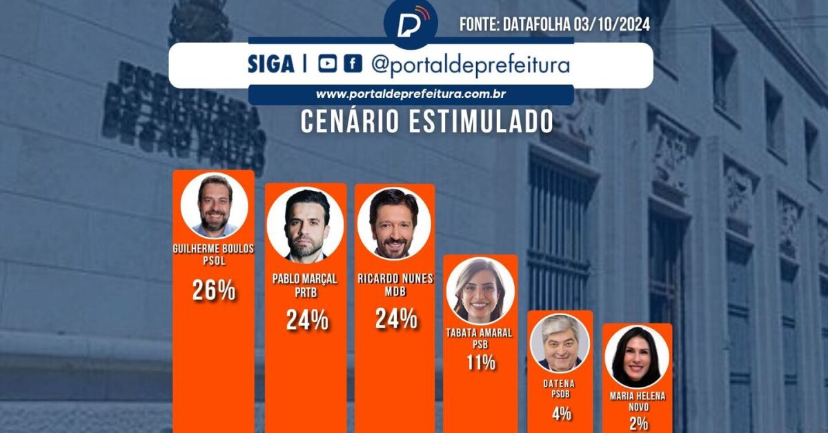 A pesquisa Datafolha divulgada nesta quinta-feira, 3 de outubro, indica um empate técnico na corrida para a prefeitura de São Paulo, com Guilherme Boulos (PSOL) liderando com 26% das intenções de voto, seguido por Ricardo Nunes (MDB) e Pablo Marçal (PRTB), ambos com 24%.