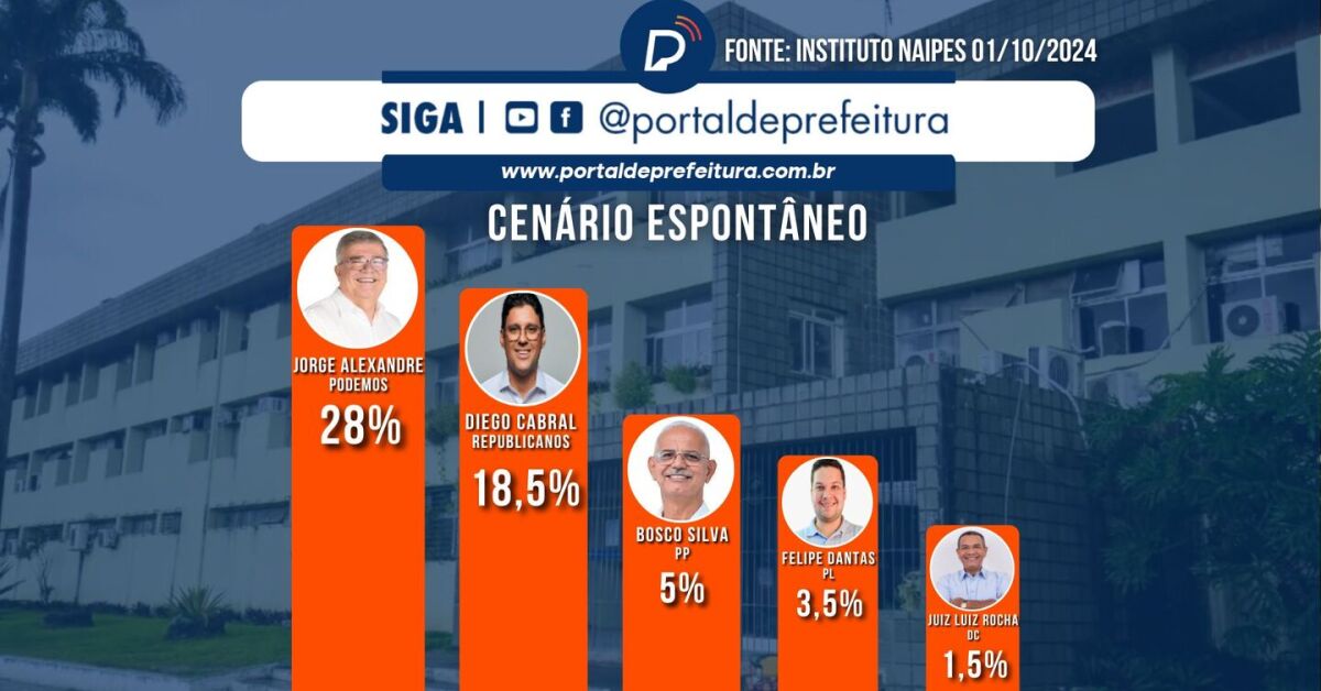 No cenário espontâneo, em que os eleitores indicam seus candidatos preferidos sem a apresentação de nomes, Jorge Alexandre surge como o favorito, com 28% das intenções de voto. A seguir aparece Diego Cabral, que se mantém em segundo lugar com 18,5%. Outros nomes, como Bosco e Felipe Dantas, aparecem com 5% e 3,5%, respectivamente, enquanto o Juiz Luiz Rocha registra 1,5% das intenções de voto.