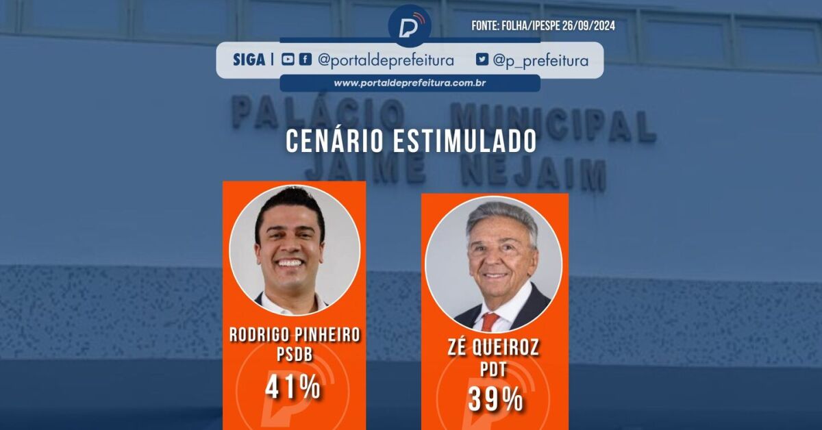 De acordo com os dados da pesquisa, Rodrigo Pinheiro lidera com 41% das intenções de voto, seguido de perto por Zé Queiroz, que aparece com 39%. A disputa entre os dois principais candidatos reforça a expectativa de uma eleição bastante competitiva, já que a diferença está dentro da margem de erro da pesquisa.