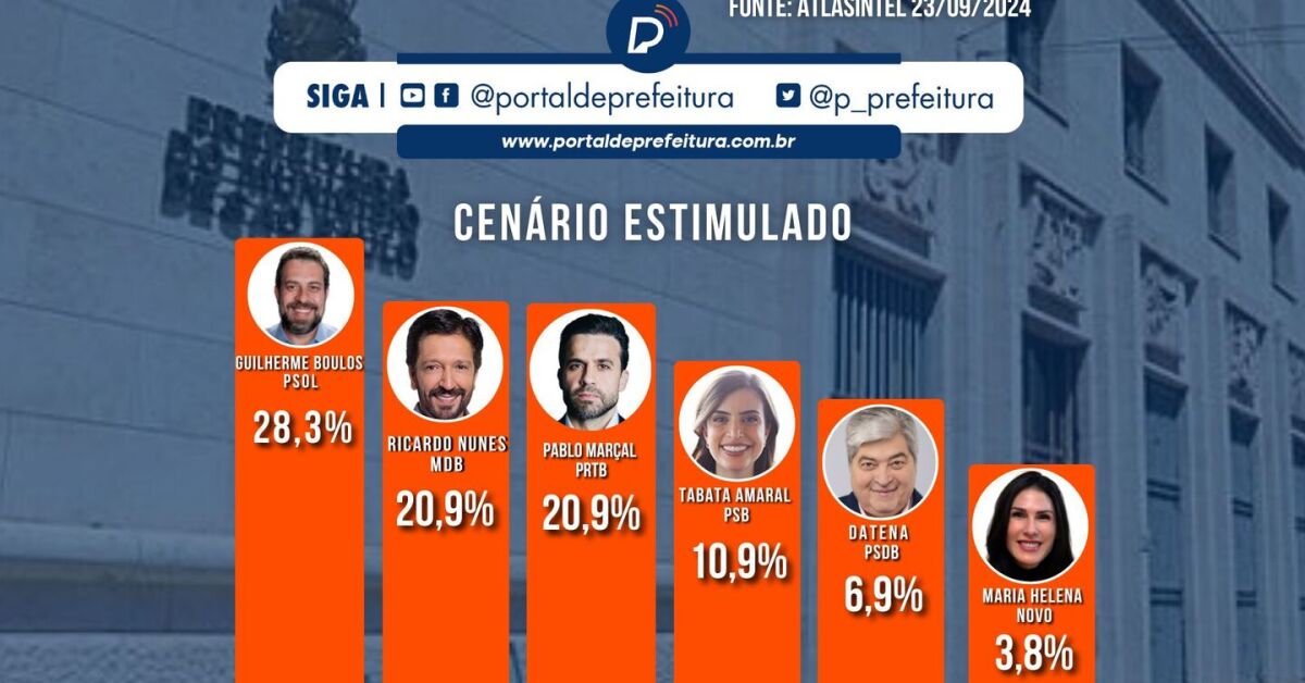 Faltando duas semanas para as eleições municipais de 2024, a nova pesquisa AtlasIntel sobre as intenções de voto para a Prefeitura de São Paulo divulgada nesta segunda-feira, 23 de setembro, aponta que o deputado federal Guilherme Boulos (PSOL) tem 28,3%.