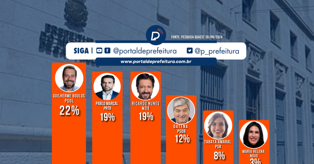 Foi divulgada nesta quarta-feira, 28 de agosto, a Pesquisa Quaest, que mostra Guilherme Boulos (PSOL) com 22%, Pablo Marçal (PRTB) e Ricardo Nunes (MDB) com 19%. Em seguida aparece Datena (PSDB) com 12%, Tabata Amaral (PSB) com 8% e Marina Helena (Novo) com 3%.