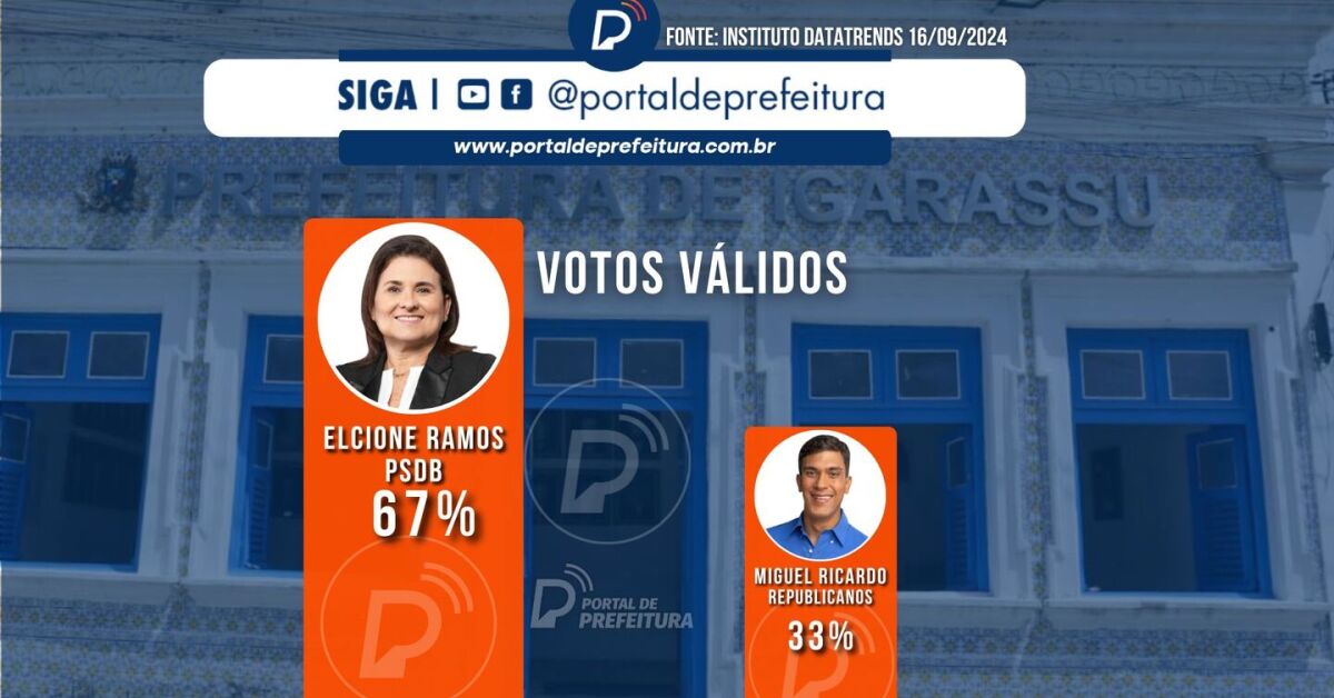 Pesquisa do Instituto DataTrends divulgada nos primeiros minutos desta segunda-feira, 16 de setembro, mostra a prefeita Professora Elcione (PSDB), liderando com ampla vantagem na disputa pela reeleição da Prefeitura de Igarassu.