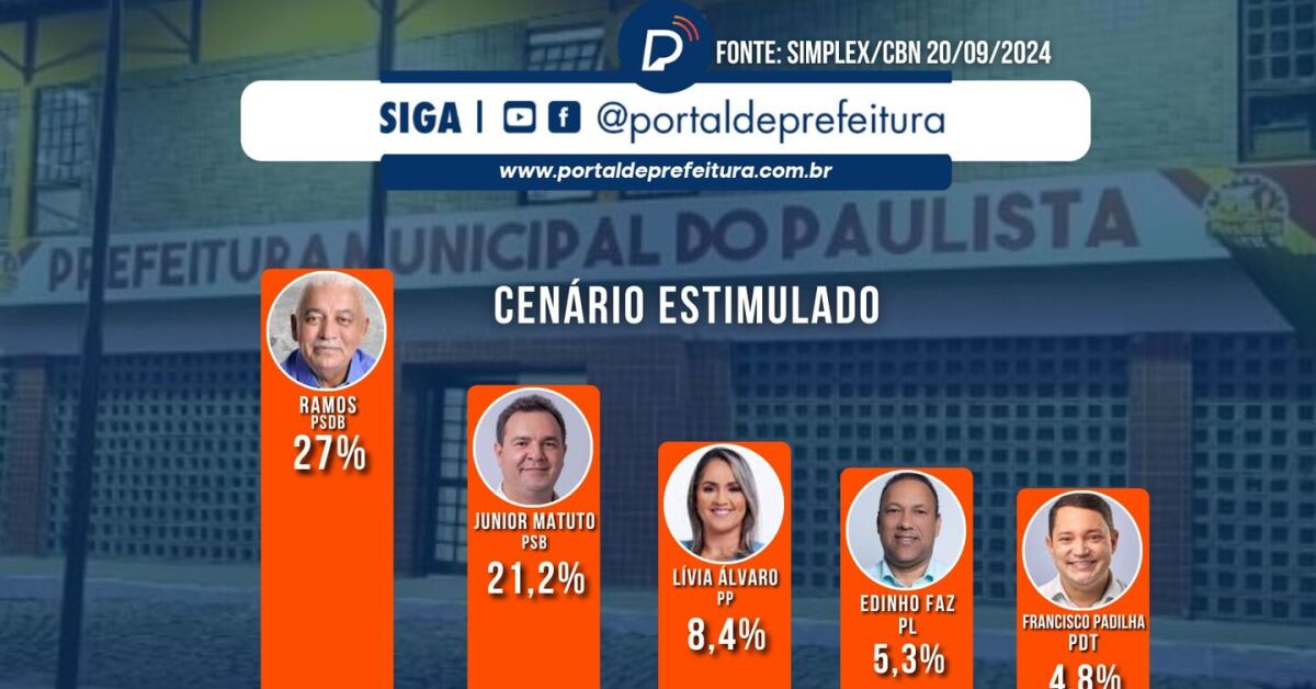 No cenário estimulado, em que os nomes dos candidatos são apresentados aos eleitores, Ramos (PSDB) lidera com 27,0% das intenções de voto. Junior Matuto (PSB) aparece em segundo lugar com 21,2%, seguido por Lívia Álvaro (PP) com 8,4%, Edinho Faz (PL) com 5,3%, e Francisco Padilha (PDT) com 4,8%. Souza Vigilante (Mobiliza) registra 0,9% e Maurílio Feitosa (PRTB) não pontua. Além disso, 16,4% dos entrevistados afirmaram que votariam em branco, nulo ou nenhum dos candidatos, enquanto 16,0% disseram não saber ou preferiram não responder.
