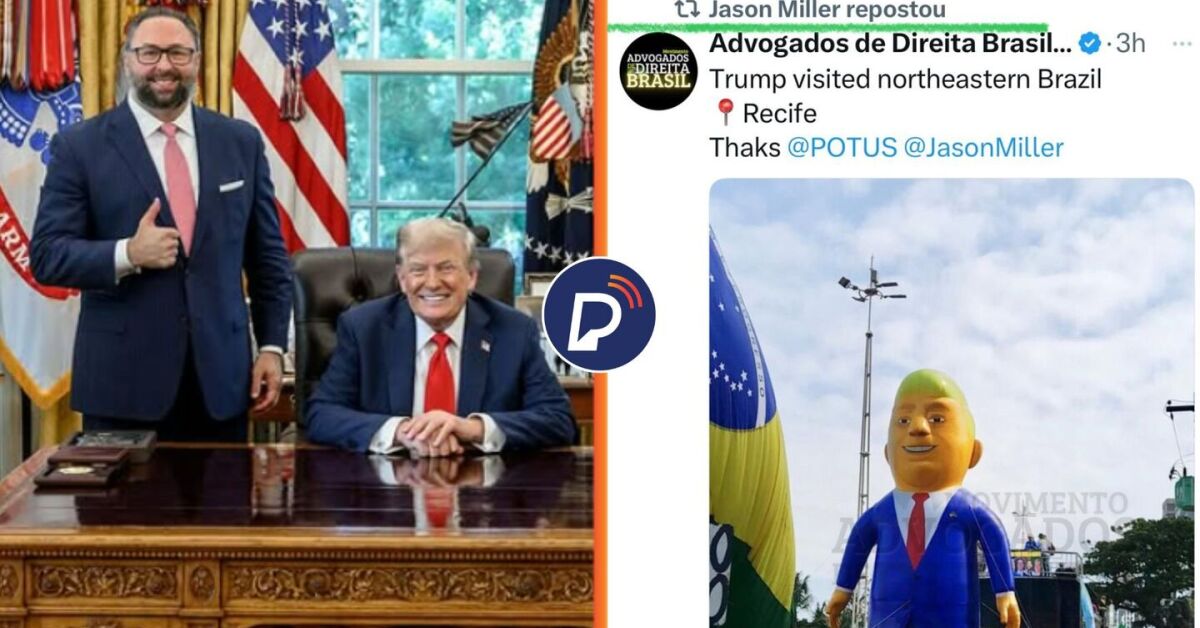 Jason Miller, principal executivo da SHW Partners LLC e ex-conselheiro sênior de Donald Trump, repostou em suas redes sociais uma imagem do boneco inflável do ex-presidente norte-americano exibido no Recife.