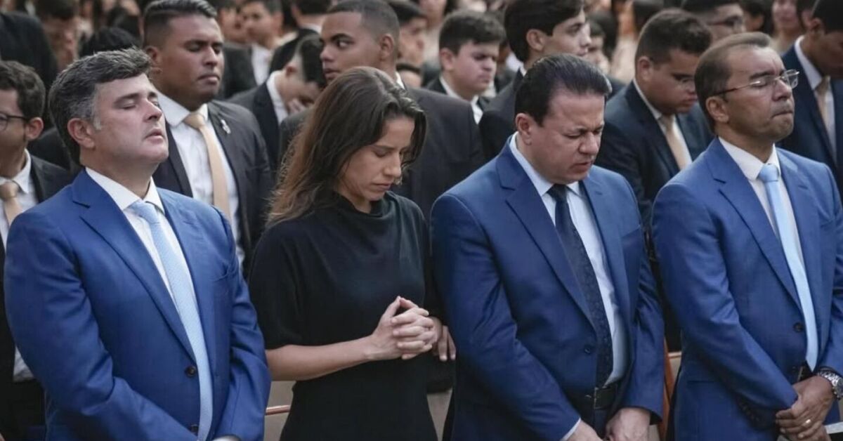 Governadora Raquel Lyra orando ao lado de Eduardo da Fonte e políticos, no 20º Congresso das Assembleias de Deus. Foto: Divulgação