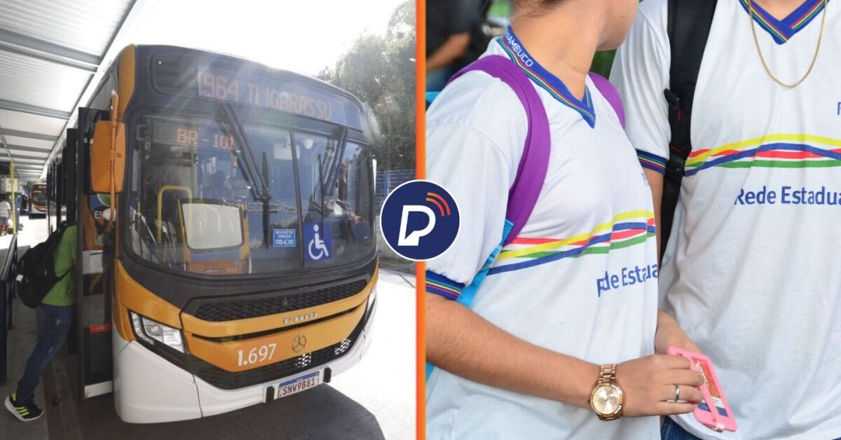 Ônibus da RMR e alunos de escola estadual. Fotos: Hesíodo Góes/Secom e Grande Recife/Divulgação. Arte: Portal de Prefeitura
