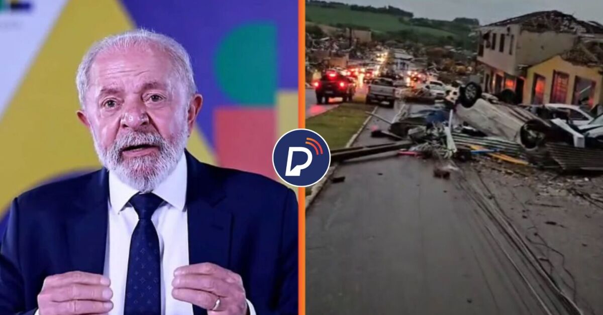 Presidente Lula em discurso e destruição em cidade do Paraná causada por tornado. Fotos: Reprodução. Arte: Portal de Prefeitura