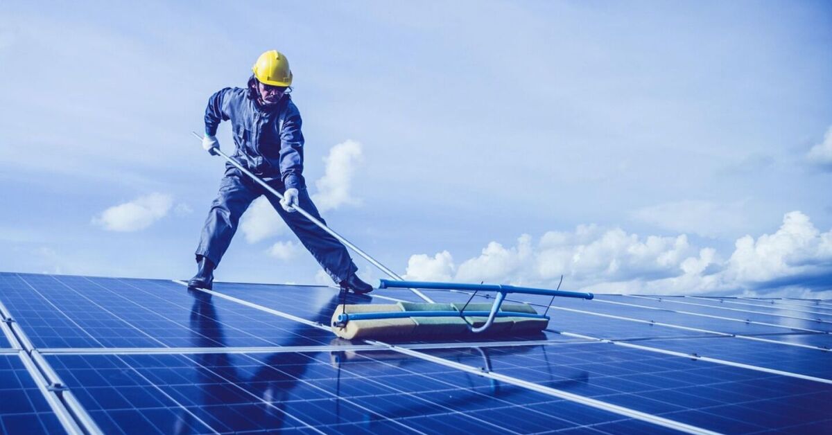 Painéis solares sendo limpos por trabalhador. Foto: Pixabay