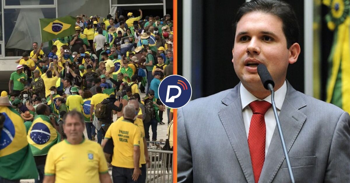 Atos do 8 de janeiro e o presidente da Câmara dos Deputados, Hugo Motta. Fotos: 8/1 / Joedson Alves/Agencia Brasil / Hugo Motta / Divulgação