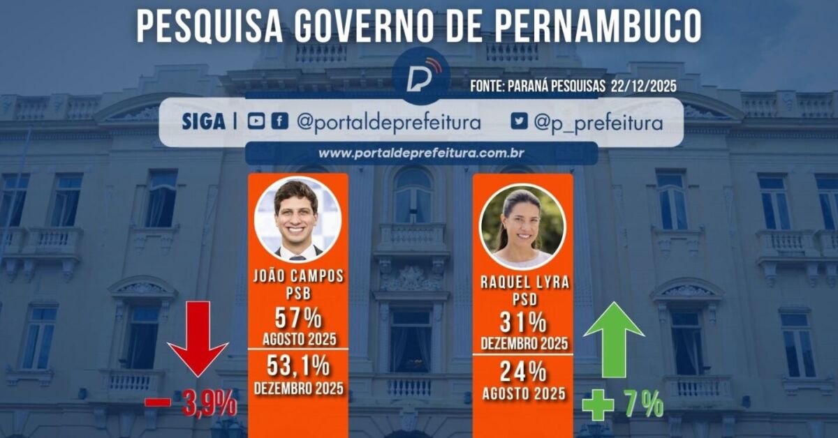 O levantamento do Paraná Pesquisas divulgado nesta segunda-feira, 22 de dezembro, revela um detalhe não muito explorado na mídia local. Apesar de apontar a dianteira por parte do prefeito do Recife, João Campos (PSB), num eventual cenário para o Governo de Pernambuco em 2026, o levantamento mostra uma queda de 3,9 pontos percentuais do socialista na comparação com a pesquisa do mesmo Instituto divulgada no mês de agosto.