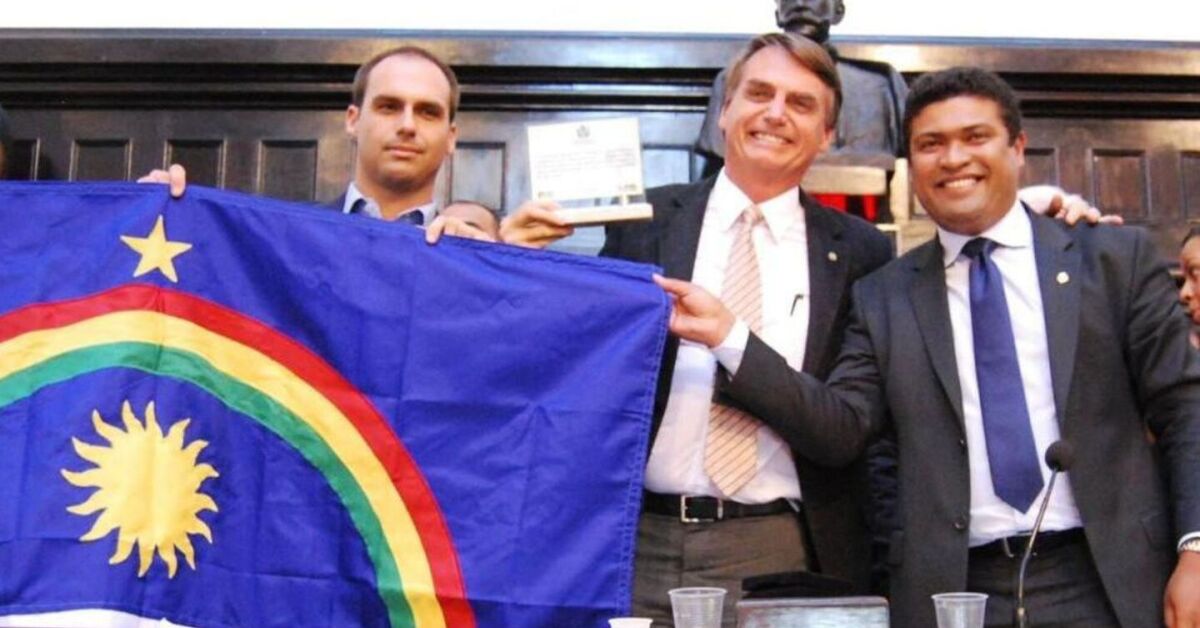 Deputado Joel da Harpa ao lado de Bolsonaro e Eduardo, segurando bandeira de Pernambuco. Foto: Divulgação