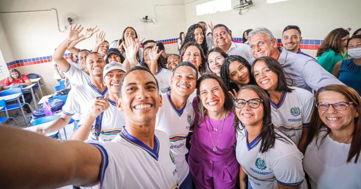 Raquel Lyra com alunos da rede estadual. Foto: SECOM/Reprodução