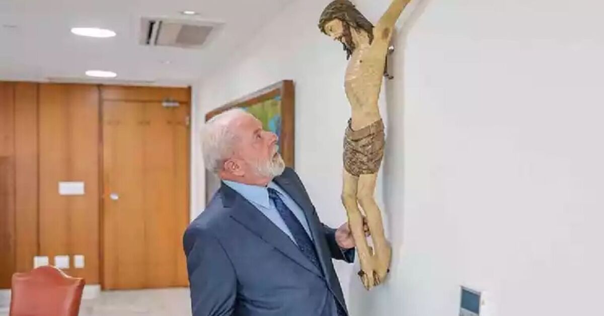 A foto ilustra o presidente Lula observando a imagem de Jesus Cristo. Foto: Ricardo Stuckert/PR