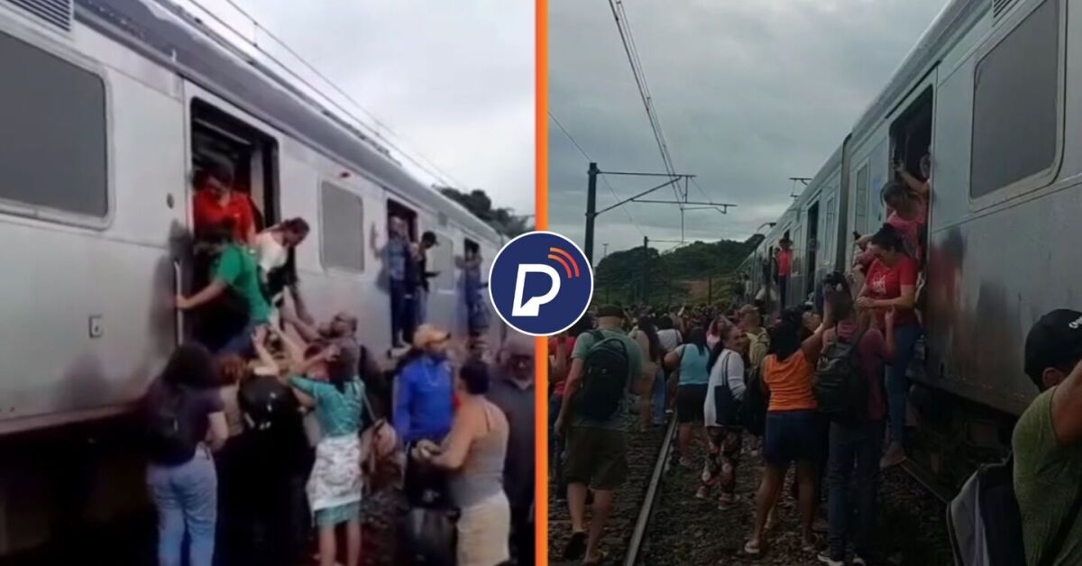 Momento em que metrô quebra e passageiros andam por trilhos. Fotos: Reprodução. Arte: Portal de Prefeitura