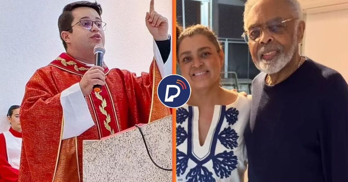 Padre processado e Gilberto Gil ao lado da filha Preta. Fotos: Reprodução. Arte: Portal de Prefeitura
