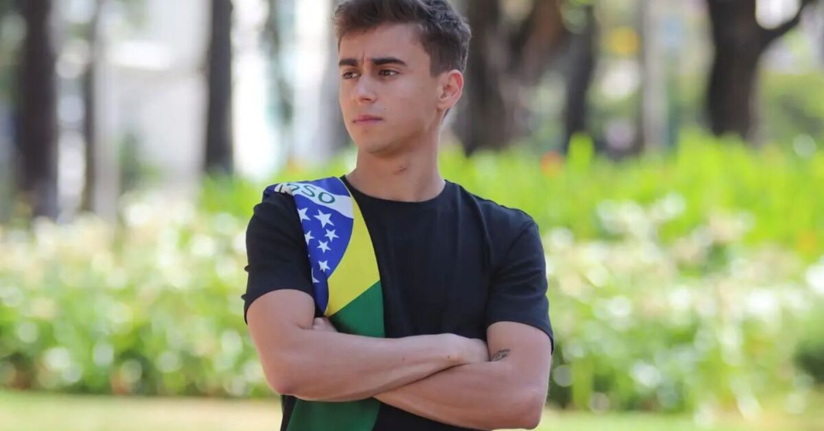 Nikolas Ferreira com bandeira do Brasil no ombro. Foto: Pablo Gomes Almeida/Divulgação