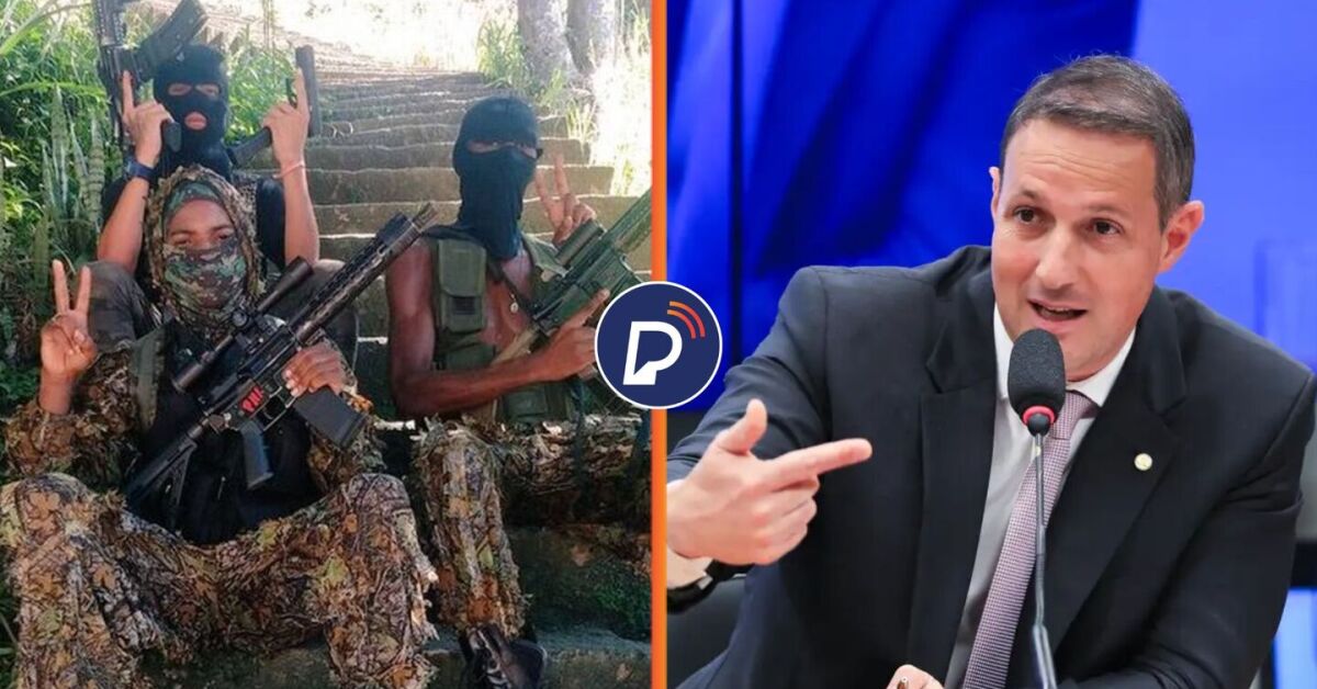 Membros de facção criminosa no Brasil e Guilherme Derrite, relator do PL e secretário de São Paulo. Fotos: Reprodução e Lula Marques/Agência Brasil. Arte: Portal de Prefeitura