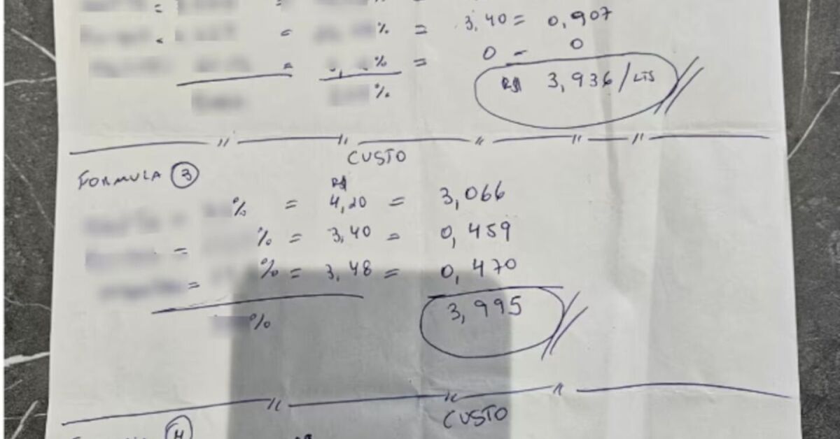 O material inclui anotações sobre a mistura de derivados e tipos de etanol, elaboradas para simular a composição da gasolina automotiva. Em uma das fórmulas, a combinação alterava o equilíbrio entre gasolina e álcool, violando as especificações de qualidade.