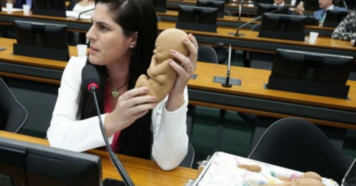 Chris Tonietto levou reproduções de fetos para apresentar argumentos. Lula Marques/Agência Brasil
