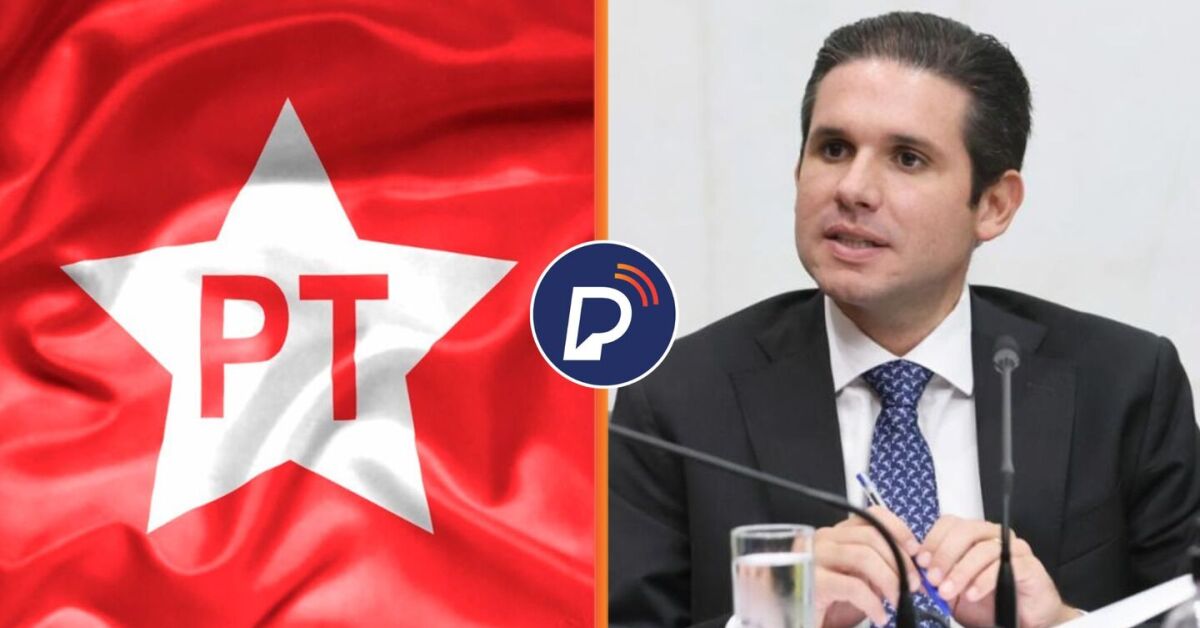 Bandeira do PT e Presidente da Câmara dos Deputados, Hugo Motta. Fotos: Divulgação e Marina Ramos/Câmara dos Deputados