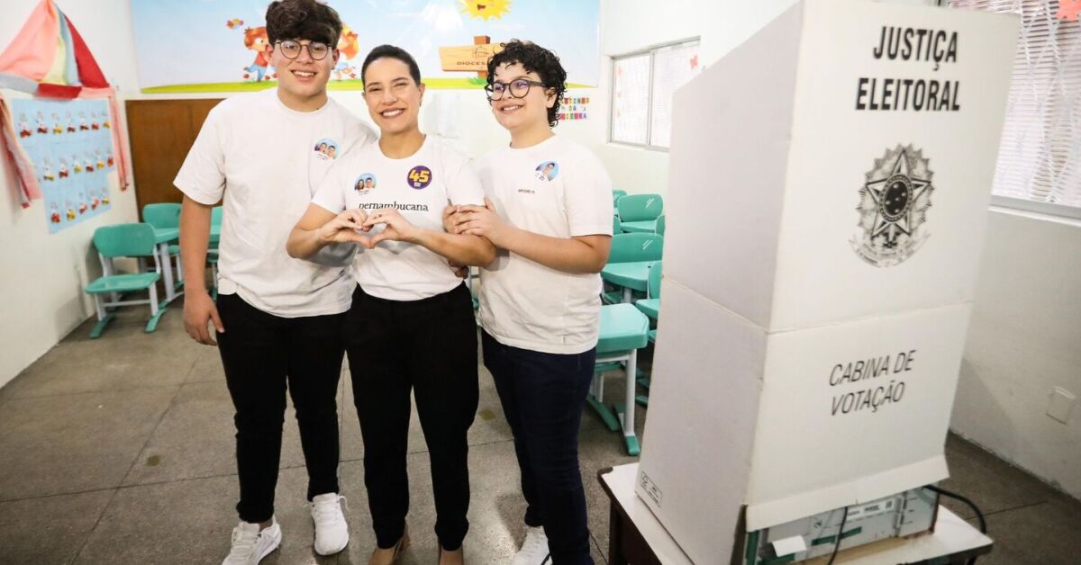Governadora Raquel Lyra com seus filhos em cabine de votação. Foto: Divulgação