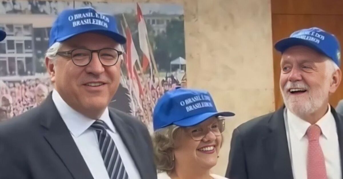 Na foto, os ministros da Educação, Camilo Santana, e das Relações Institucionais da Presidência, Alexandre Padilha, que estão licenciados e reassumiram seus mandatos de senador e deputado, respectivamente, estão ao lado do líder do governo no Congresso, senador Randolfe Rodrigues (PT-AP). Eles usam um boné com uma referência ao distribuído pelo presidente Donald Trump na campanha das eleições americanas, com os dizeres: "O Brasil é dos Brasileiros".