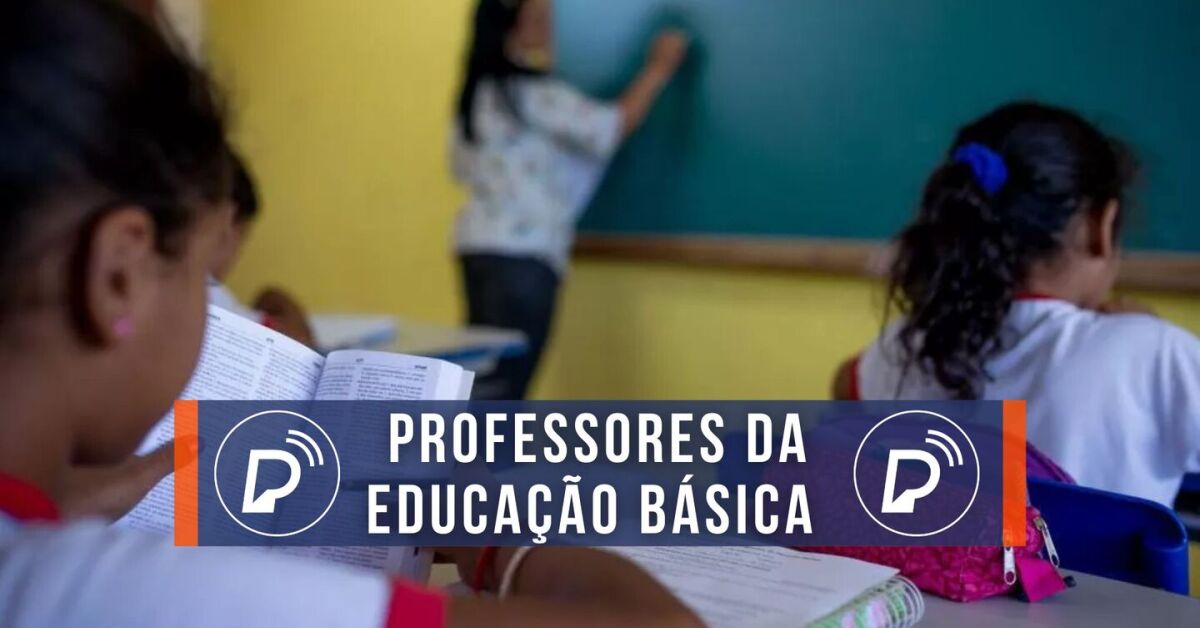Professora da educação básica dando aula. Foto: Agência Brasil/Arquivo. Arte: Portal de Prefeitura