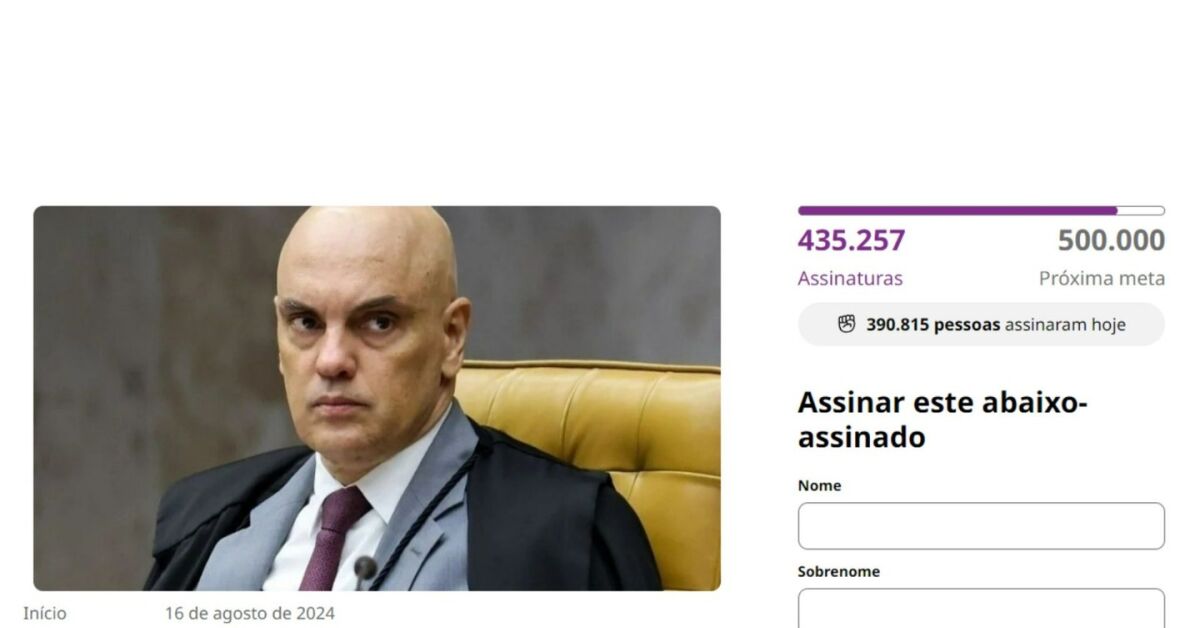 Uma petição online pedindo o impeachment do ministro do Supremo Tribunal Federal (STF) Alexandre de Moraes alcançou mais de 400 mil assinaturas neste sabado (17). O abaixo-assinado, lançado na plataforma Change.org, foi promovido por congressistas associados ao ex-presidente Jair Bolsonaro (PL) e surge em resposta à divulgação de mensagens que indicam uma possível utilização informal do Tribunal Superior Eleitoral (TSE) por Moraes para fundamentar inquéritos contra apoiadores de Bolsonaro.