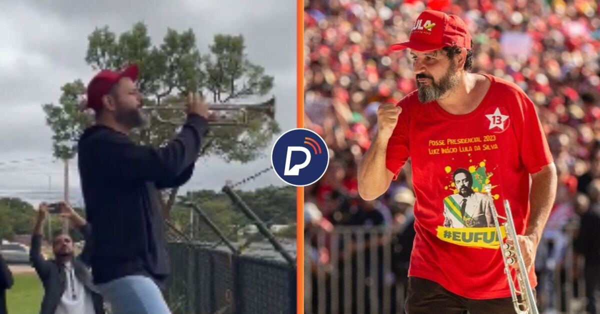 Trompetista rouba a cena novamente ao tocar "Tá na hora do Jair" na PF após prisão de Bolsonaro Fotos: Reprodução / Redes Sociais / @Trom_Petista / @joedsonalves & @LulaMarques