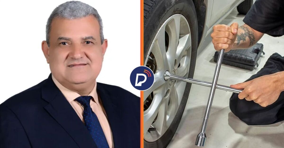Vereador Laércio Noberto Júnior ao ladode uma imagem ilustrativa de uma chave de roda. Foto: Divulgação