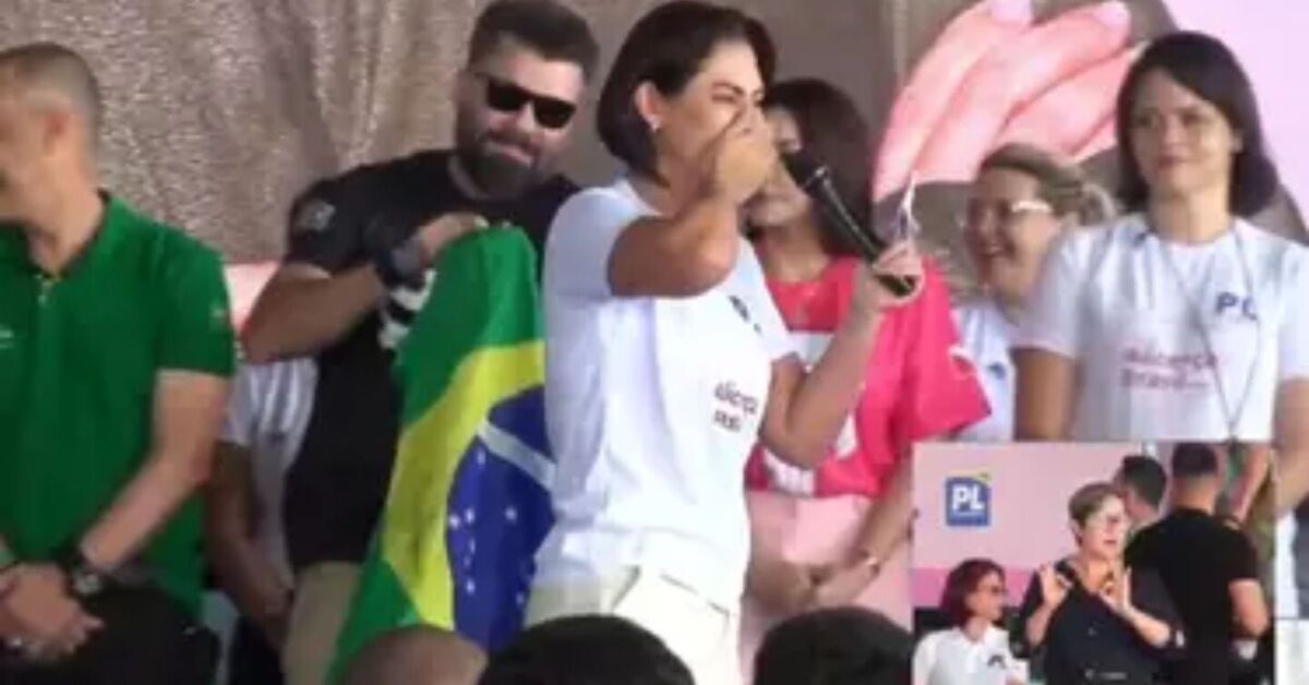 Aos gritos de “volta, Bolsonaro” vindos da plateia, Michelle chorou ao lamentar a ausência do ex-presidente Jair Bolsonaro (PL), impedido de comparecer ao evento por medidas cautelares impostas pelo Supremo Tribunal Federal (STF).