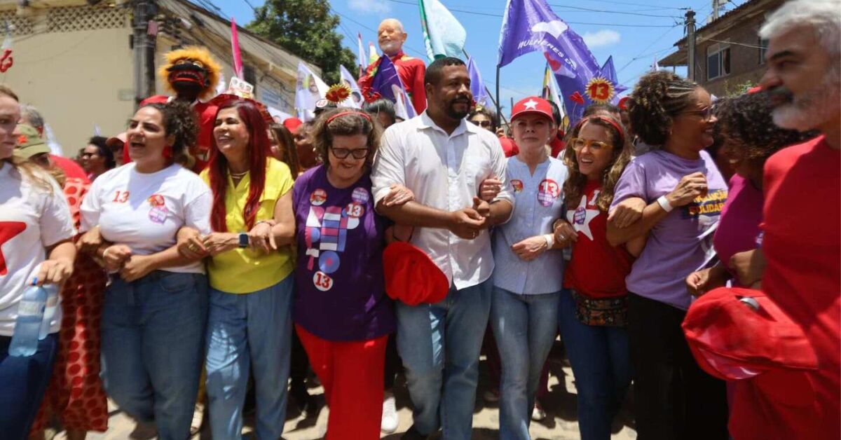 Mulheres participaram de ato nas ruas de Peixinhos, em Olinda, para apoiar o candidato à Prefeitura de Olinda, Vinicius Castello (PT), na manhã deste sábado, 19 de outubro.