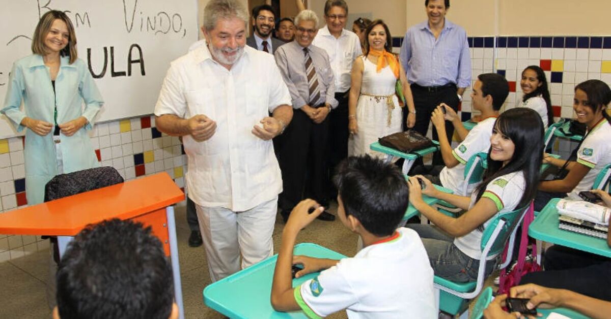 Presidente Lula com estudantes em escola. Foto: Divulgação