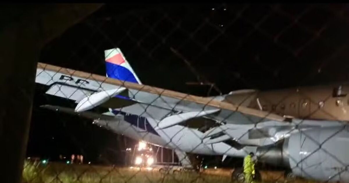 Avião da LATAM após ultrapassar pouso em pista. Foto: Reprodução/Cláudia Pletsch