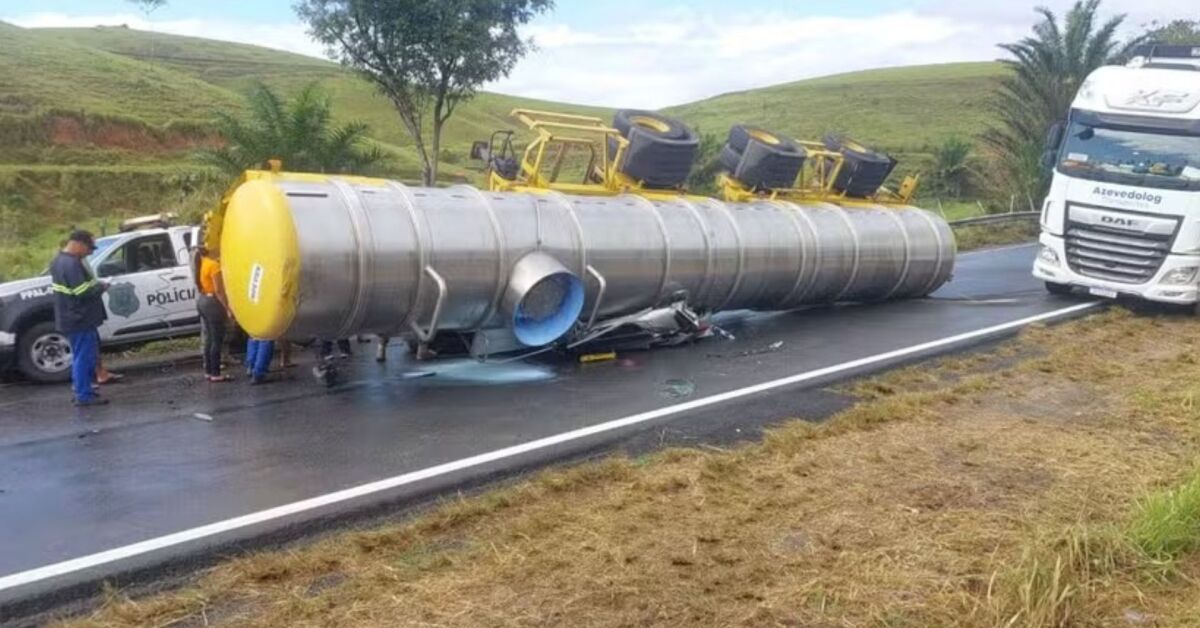 O motorista do caminhão saiu ileso e relatou à PRF que perdeu o controle após o pneu do tanque sair para o acostamento, que está em um nível inferior, e capotou ao tentar retornar para a rodovia.